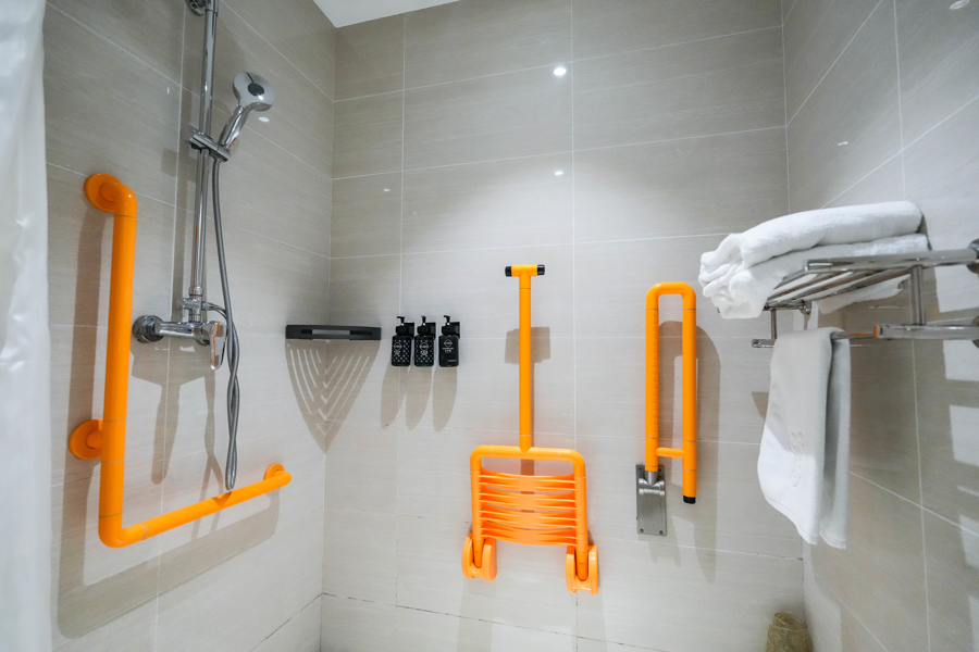 上海景苑水庄酒店早在2021年,就完成了10间无障碍“关爱客房”的全面改造,每一处设计都透着看得见的贴心。工作人员介绍,客房卫生间采用零门槛的无高差设计,轮椅进出毫不费力;淋浴区装了折叠式沐浴凳,行动不便者坐着就能洗澡,旁边还配了安全扶手,地砖也做了防滑处理,手持花洒高度能自由调节;就连房门和卫生间门框都特意加宽,轮椅能顺畅通过;电源开关、灯光控制和插座都往下挪了位置,坐着伸手就能碰到;每个床头柜旁还装了紧急呼叫按钮,一按就能直通服务中心,有需求随时能响应。